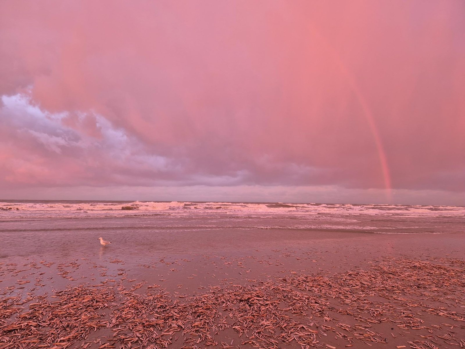 Vanmorgen ging ik, nog voor het ontbijt, naar datzelfde strand. Knalroze kleurde de lucht bij het opkomen van de zon. Zie ik nou een… Roze regenboog? Hoe langer ik keek hoe meer kleur de regenboog kreeg. Rainbows & unicorns. Ze bestaan echt… Was het enige wat ik kon bedenken, grinnikend over haar unicorn-tas in mijn hotelkamer.